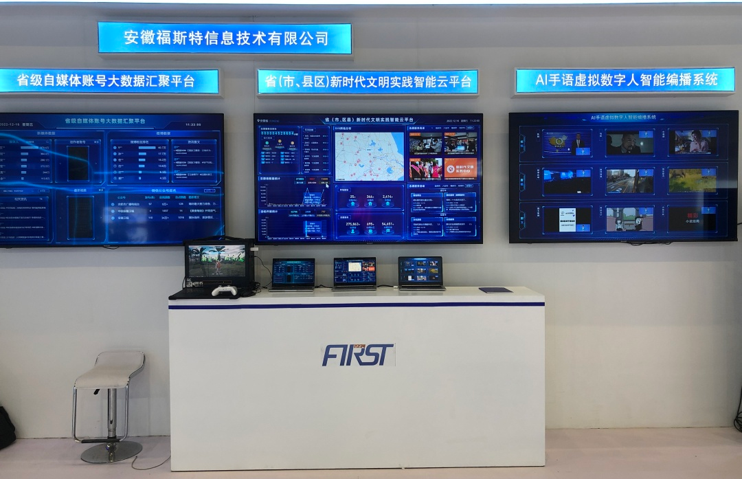 安徽福斯特信息技術有限公司此次應邀參展,以廣電媒體發展為亮點,集中展示大數據、人工智能,呈現了AI-VLOG視頻智能合成系統+AI手語虛擬數字人智能編播系統+省級自媒體賬號大數據匯聚平臺+?。ㄊ?、縣區)新時代文明實踐智能云平臺技術。